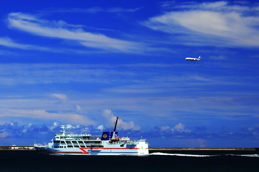 慶良間諸島へ就航している「フェリーざまみ3」とBoeing787型機の絡み。