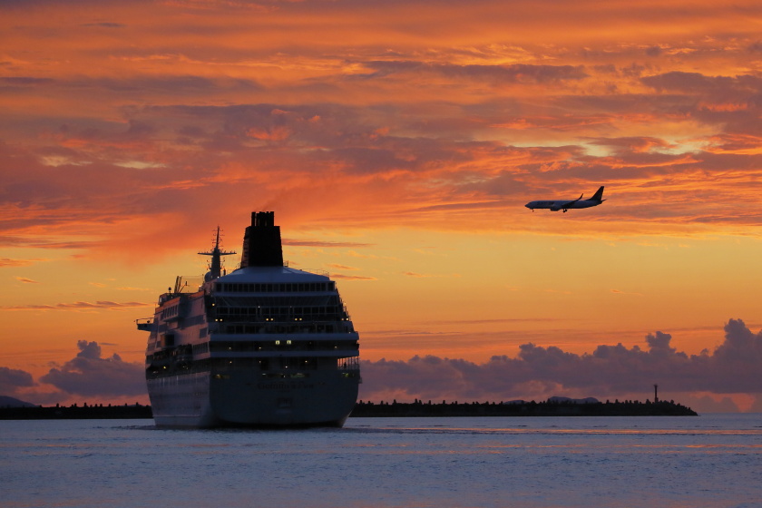 海と空の乗り物と夕景も合わさり、ロマンあふれる一枚になったと思う。